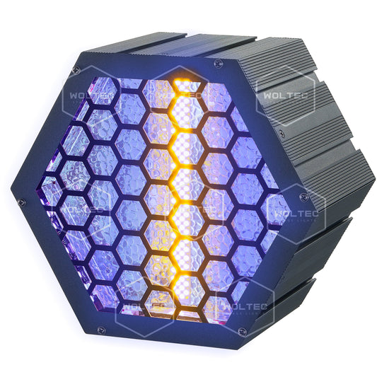 WOLTEC 7 LED Hexagon Retro Stage Light Audience Blinder for Background of Disco and DJ Parties – A Warm White Sound Active & DMX Rave Light with Tungsten-Look Filament and RGBW Glow of Strobe Lamp